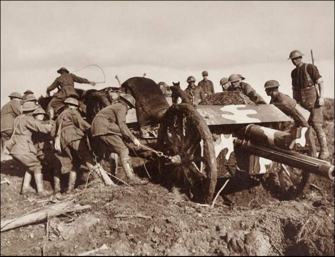 Keywords: FrankHurleyCamouflagedAustralian18pounder.jpg An 18 pounder gun being hauled through the mud at Broodseinde Ridge to a position further forward in support of the advancing Australians two days before the initial attack on Passchendaele Ridge in the Ypres sector <p>Identified left of the gun left to right Gunner Gnr W E Drummond Gnr J Brannon to Drummond's right http //deepthought hass adfa edu au 8080/showPerson pid 65067 Gnr C V Cox in front of Brannon two men unidentified behind Cox http //deepthought hass adfa edu au 8080/showPerson pid 135944 34401 Gnr A Hewitt in front of Cox http //deepthought hass adfa edu au 8080/showPerson pid 265860 Dvr A C Sampson standing on wheel back to camera http //deepthought hass adfa edu au 8080/showPerson pid 82731 Gnr G G Dowling foreground pulling rope on front wheel Right side of gun left to right Dvr Hughes http //deepthought hass adfa edu au 8080/showPerson pid 236386 Dvr F Peace unidentified unidentified http //deepthought hass adfa edu au 8080/showPerson pid 107845 Bombardier T R Garniss Sergeant W Reynolds extreme right standing back Comment Note armoured oil reservoir on end of recuperator <br>See First Battle of Passchendaele E01208 10 October 1917 First exhibited at the Kodak Salon Sydney 1919 Frank Hurley Copyright clear PD-AustraliaGov QF 18 pounder World War I forces of Australia in Belgium Ypres 1917 First Battle of Passchendaele World War I Photographs by Frank Hurley Black and white photographs |