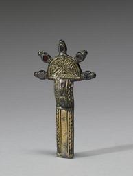 Keywords: Frankish - Bow Fibula - Walters 542444.jpg Bow fibulae are also called digitated fibulae due to the radiating knobs that resemble fingers or digits emerging from the headplate The knobs of early 4th-century fibulae were functional and held the springs of the pin At a later date as in this five-knobbed example made in the first half of the 6th century the knobs were purely decorative This five-knobbed fibula is set with red glass pastes on the digits and garnets on the bow It is a type commonly found in northern France and the Rhineland 1st half Other date century 6 Early Medieval gilt bronze with garnets and glass paste cm 9 1 5 2 0 9 accession number 54 2444 11727 Carlebach Gallery New York date and mode of acquisition unknown Walters Art Museum 1959 by purchase Museum purchase with funds provided by the S A P Fund 1959 Objects of Adornment Five Thousand Years of Jewelry from the Walters Art Gallery Baltimore Cooper-Hewitt National Design Museum New York; Chrysler Museum of Art Norfolk; Carnegie Museum of Art Pittsburgh; San Antonio Museum of Art San Antonio; Philbrook Museum of Art Tulsa; Honolulu Academy of Arts Honolulu; New Orleans Museum of Art New Orleans; Milwaukee Art Museum Milwaukee; Minneapolis Institute of Arts Minneapolis; Toledo Museum of Art Toledo; The John and Mable Ringling Museum of Art Sarasota 1984-1987 Jewelry from the Walters Art Museum and the Zucker Family Collection The Walters Art Gallery Baltimore 1987 Smith College Museum of Art Early Medieval Research Smith College Museum of Art Northampton 1996 Jewelry - Ancient to Modern The Walters Art Gallery Baltimore 1979-1980 place of origin Rhineland Germany Walters Art Museum license Sösdala-Untersiebenbrunn style Medieval metalwork in the Walters Art Museum Jewellery in the Walters Art Museum Merovingian fibulae Media contributed by the Walters Art Museum needs category review Julius Carlebach 6th-century works |