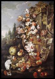 Keywords: Franz Werner von Tamm - Still Life of Flowers and Fruits in a Garden - Walters 371674.jpg A deceptively casual cascade of sweet-smelling roses tulips and other cultivated flowers combined with luscious ripe fruit including a melon grapes and a pomegranate sliced open is set before a classicizing urn in an aristocratic garden accompanied by a rabbit and guinea pig The owner of a palatial home in Rome or northern Europe around 1700 would appreciate this still life as a frank celebration of abundance fertility and the satisfaction of indulging the senses that would bring cheer to the walls even in the depths of January Tamm worked for princely collectors in Rome and Vienna where a similar composition was commissioned in 1707 by the prince of Liechtenstein for his palace there Such large decorative paintings were commonly hung in massed groupings like the present one The dark rich style owes much to Neapolitan still-life painters whose work was popular in Rome Indeed this painting and its companion Walters 37 1673 have also been attributed to the Neapolitan Nicola Malinconico 1663-1721 Zeri Italian paintings in the Walters Art Gallery 349 470-471 between 1700 1710 Baroque Oil on canvas Painted surface cm 171 5 123 5 accession number 37 1674 33606 Don Marcello Massarenti Collection Rome date and mode of acquisition unknown 1897 catalogue no 446 as Mario dei Fiori Henry Walters city Baltimore Walters Art Museum Henry Walters Acquired by Henry Walters with the Massarenti Collection 1902 World of Wonder The Walters Art Gallery Baltimore 1971-1972 place of origin Vienna Austria Walters Art Museum license 2D Baroque paintings in the Walters Art Museum Franz Werner von Tamm Media contributed by the Walters Art Museum needs category review Media contributed by the Walters Art Museum needs artist update