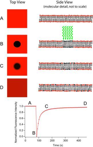 Keywords: Frap diagram.svg en Simulation and schematic diagram of the FRAP fluorescence recovery after photobleaching experimental process Own MDougM 2008 Scientific modeling SVG cell biology Molecular and cellular biology Cell membrane