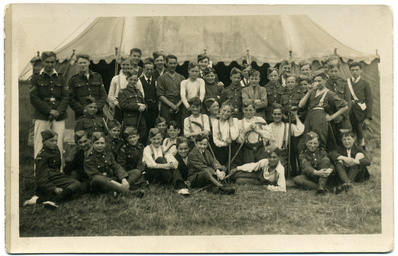 Keywords: Fred C Palmer Boys Brigade 001.jpg Postcard portrait of South London Boys Brigade probably taken at or near Herne Bay Kent England from 1907 to 1922 The group is probably at summer camp The postcard is unused postally The photographer was Fred C Palmer who was working at Tower Studio Herne Bay Kent 1907-1922 who is believed to have died 1936-1939 On the back of the unused card is printed F C Palmer Tower Studio Herne Bay Someone has handwritten in pencil 46 S London BB This print has darkened with age but it would be inappropriate to adjust the brightness because detail would be lost Points of interest A boy at the front is wearing a caliper; he is probably a polio survivor A few boys at the front are wearing puttees The boy with the glass is reflecting popular contemporary music-hall humour Fred C Palmer has done or said something just enough to make the boys smile but so as not to make the group fall apart with laughter; a difficult balance to achieve with young excited kids The boy in uniform who is standing almost in front of the man in waistcoat and watch-chain has London written on his shoulder Two of the adults in charge are discreetly holding cigarettes in their folded hands Border The remaining border of this image is important for researchers of this photographer Some photographers trimmed their images more than others and Palmer has a reputation for producing smaller postcards than other early 20th century UK photographers He took his own photos developed them in-house onto postcard-backed photographic paper and trimmed them himself It is worth adding that during hand-developing the border is actively masked with equipment which both crops the picture and causes the white frame or border to appear on the paper This frame is part of the design and is one of the reasons why the quality of Palmer's work is so interesting and why there is an article and category for him on English Wiki Researchers need to see exactly where the edge of the postcard is The darker part of the white frame on the left is of interest as it gives a clue to the development process and the equipment used Thank you for taking the time to read this Scan of original postcard in my possession 1907-1922 Fred C Palmer died 1936-1939 out of copyright PD-old-70-1923 Fred C Palmer of Herne Bay Herne Bay Kent Black and white photographs of boys Boys' Brigade