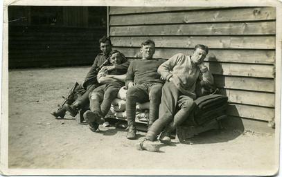 | Keywords: Fred C Palmer Wounded Soldiers WWI near Herne Bay.jpg Postcard photo of wounded soldiers during World War I The location would be in the Herne Bay or Canterbury area They wear puttees and spurs The photographer was Fred C Palmer of Tower Studio Herne Bay Kent but the card just says Fred C Palmer Herne Bay Palmer died in 1941 The soldiers based closest to Palmer's studio in 1914-1918 were The Buffs East Kent Regiment which raised nine battalions in World War I Today the Buffs are amalgamated into the Princess of Wales's Royal Regiment ;Points of interest The regiment has not yet been identified The soldier on the left has his right leg in a splint or caliper The man on the right is sitting awkwardly possibly indicating a wound in his back Border The remaining border of this image is important for researchers of this photographer Some photographers trimmed their images more than others and Palmer has a reputation for producing smaller postcards than other early 20th century UK photographers He took his own photos developed them in-house onto postcard-backed photographic paper and trimmed them himself It is worth adding that during hand-developing the border is actively masked with equipment which both crops the picture and causes the white frame or border to appear on the paper This frame is part of the design and is one of the reasons why the quality of Palmer's work is so interesting and why there is an article and category for him on English Wiki Researchers need to see exactly where the edge of the postcard is Thank you for taking the time to read this Scan of original postcard in my possession 1914 - 1918 Fred C Palmer died 1941 out of copyright PD-old-70-1923 Fred C Palmer of Herne Bay World War I forces of Britain Soldiers of the United Kingdom |