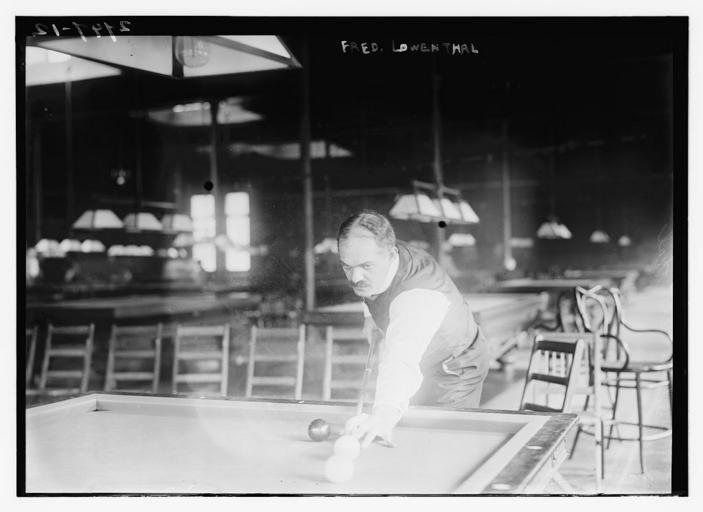 | Keywords: Fred Lowenthal (LOC).jpg Bain News Service publisher Fred Lowenthal between ca 1910 and ca 1915 1 negative glass ; 5 x 7 in or smaller Notes Title from unverified data provided by the Bain News Service on the negatives or caption cards Forms part of George Grantham Bain Collection Library of Congress Format Glass negatives Rights Info No known restrictions on publication Repository Library of Congress Prints and Photographs Division Washington D C 20540 USA http //hdl loc gov/loc pnp/pp print hdl loc gov/loc pnp/pp print General information about the Bain Collection is available at http //hdl loc gov/loc pnp/pp ggbain hdl loc gov/loc pnp/pp ggbain Persistent URL http //hdl loc gov/loc pnp/ggbain 15109 hdl loc gov/loc pnp/ggbain 15109 Call Number LC-B2- 2947-12 http //www flickr com/photos/library_of_congress/4668751565/ Fred Lowenthal LOC LOC-image ggbain 15109 http //www flickr com/people/8623220 N02 The Library of Congress http //www loc gov/rr/print/195_copr html noknown The Library of Congress Flickr Commons PD-Bain The Library of Congress http //flickr com/photos/8623220 N02/4668751565 2012-10-11 18 50 35 pd Sportspeople from the United States Pool players |