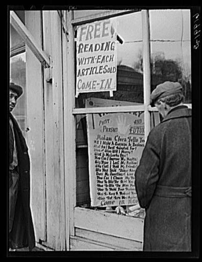 Keywords: Free readings for fortune telling.jpg Uploaded with en wp UW marker 2012 12 03 Free readings for fortune telling Library of Congress Farm Security Administration PD-USGov Reading Chiromancy Shop windows in the United States