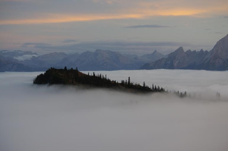 Keywords: freedom longing mountains fog berchtesgaden mountain forests mysticism feeling steam summit wide alpine hiking holiday autumn evening landscape nature hike relaxation island idyllic romantic