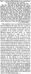 | Keywords: Freeman's Journal 28 January 1863 Letter to the Editor by J. J. McCarthy and its Response.png Letter to the editor by J J McCarthy demanding the publication of his letter to the Dublin Builder which was commented upon in the Freeman's Journal and its response by the editor John Gray Published on p 3 of the Freeman's Journal of 28 January 1863 Scan downloaded from the collection British Newspapers 1600 “1900 of Gale 1863-01-28 J J McCarthy and Sir John Gray PD-old-100 Transcription THE VANDAL RESTORERS OF ST PATRICK'S <br/> <small>TO THE EDITOR OF THE FREEMAN </small><br/> 183 Great Brunswick-street Jan 27th Sir ”The only reply I am disposed to give to the Freeman's article of the 23rd inst and Messrs Murphy and Son's letter of yesterday is my letter which has been the occasion of both The readers of the Freeman's Journal and they are necessarily a more extensive class than the readers of the Dublin Builder can without my letter know only one side of the question I have therefore to request that the Freeman in a spirit of fair play will publish my letter to the editor of the Dublin Builder I shall then be content to allow those who interest themselves in such matters to form their own opinions on the restorations in question ”I am Sir your obedient servant J J M'CARTHY We publish the above extraordinary letter received from Mr M'Carthy last night and must say that we never remember to have heard of such a proposed mode of replying to refutations of statements as the republication of the refuted statements Had Mr M'Carthy adopted the usual course of sending his letter criticising our notice of the magnificent work undertaken by Mr Guinness to this journal for publication we would at once have published it But instead of this Mr M'Carthy without ever even intimating to us his intention of doing so wrote a very uncandid and unsustainable letter to another journal in which he undertool to criticise but only succeeded in demonstrating that he was inspired rather by personal feeling than by knowledge of true art It would have afforded us much amusement to have published Mr M'Carthy's attack on the restorations of St Patrick's and experience of himself had he sent it to us in the ordinary course; but really we must be excused if we decline to publish not by way of a reply to a refutation of his pretence to art knowledge an attempt to set aside the facts by which his fallacies were overthrown but the veritable antique epistle of over two columns in length which we have already dissected perhaps rather less tenderly that was agreeable either to its author or to ourselves It is gratifying however to find that the only answer Mr M'Carthy could concoct is a mere repetition of his refuted pretensions ”refuted too by the evidence of his own witnesses If Mr M'Carthy has a reply to make to either our article or to Mr Murphy's letter we will cheerfully give space to his reply ”Ed F J J J McCarthy Restoration of St Patrick's Cathedral Dublin 1860 “1865 1863 newspapers Letters to the editor |