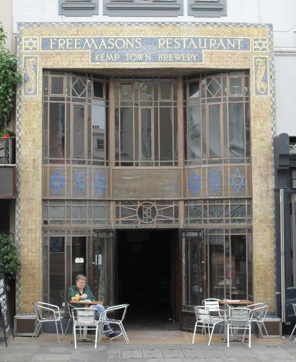 Keywords: Freemasons Restaurant, Western Road, Hove (Restaurant Façade).jpg Freemasons Inn and Restaurant 39 Western Road Brunswick Town Hove City of Brighton and Hove East Sussex restaurant façade The inn was built in about 1850; an elaborately decorated Art Deco-style restaurant was added in 1928 http //www heritagegateway org uk/Gateway/Results_Single aspx uid 365664 resourceID 5 Listed at Grade II by English Heritage IoE Code 365664 own 2010-07-10 The Voice of Hassocks Grade II listed buildings in Brighton and Hove Buildings in Hove 2010 in East Sussex July 2010 in England Mosaics in the United Kingdom |