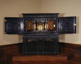 | Keywords: French - Cabinet with Mythological Scenes - Walters 6519 - Front Open.jpg Elegant cabinets made of polished ebony a black wood from Africa or India were prized at the French court during the reign of King Louis XIII 1601-43 as works of art as well as places to keep precious possessions The exterior of this one is carved with reliefs depicting moralizing scenes from Greek and Roman mythology In contrast the playful interior is like a theater set replicating the intricate architecture of a grand residence Alcoves and false vistas of Roman ruins create shifting perspectives complemented by the inlay pattern of the floor In the ceiling painting Icarus falls to his death because the wax he used to attach the wings to his back melted when he flew too near the sun The drawers are carved with everyday activities from each month in a farmer's year beginning with January represented by idle peasants carousing before a fire between 1630 1650 wood ebony veneer marquetry of various woods and bone wood gilded bronze mounts dyed ivory and paint cm 192 176 accession number 65 19 4900 Baron de Boisseau prior to 1876 Henry Walters Baltimore date and mode of acquisition unknown Walters Art Museum Henry Walters Acquired by Henry Walters World of Wonder The Walters Art Gallery Baltimore 1971-1972 Highlights from the Collection The Walters Art Gallery Baltimore 1998-2001 place of origin France Walters Art Museum license Baroque art in the Walters Art Museum Furniture in the Walters Art Museum Art of France in the Walters Art Museum Media contributed by the Walters Art Museum needs category review |