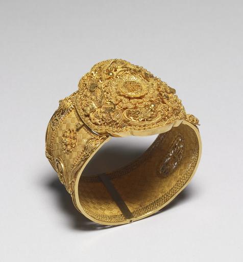 | Keywords: French - Cannetille Ware Bracelet - Walters 572332 - Three Quarter.jpg  This bracelet is emblematic of Chinese filigree work that was produced for the European market in the mid-19th century It has been mis-attributed as being French cannetille however the style the shape of the medallion the dragon and phoenix motif all indicate Chinese craftsmanship most likely completed in Singapore in the mid- to late- 1800s between 1840 1860 gold cm 5 08 6 35 accession number 57 2332 77180 Mr George Harold Edgell date and mode of acquisition unknown Mrs Jean Walters Delano Edgell date and mode of acquisition unknown Mr Henry Walters Edgell Manchester New Hampshire date and mode of acquisition unknown Mrs Elizabeth Edgell February 9 1986 by gift from her husband Mr Henry Walters Edgell Walters Art Museum Gift of Mrs Elizabeth Edgell 2010 Bedazzled 5 000 Years of Jewelry from the Walters Art Museum Frist Center for the Visual Arts Nashville; The John and Mable Ringling Museum of Art Sarasota; The Walters Art Museum Baltimore 2006-2009 place of origin China or Singapore Walters Art Museum license Bracelets Jewellery of France Gold jewellery Jewellery in the Walters Art Museum Art of France in the Walters Art Museum Filigree |