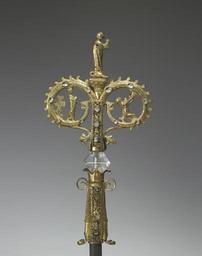 | Keywords: French - Choirmaster's Crozier with Saints Valerie, Martial, and Michael - Walters 5383 - Back.jpg This unusual crozier branches into two volutes containing on one side St Valerie kneeling with her decapitated head guided by a small angel St Martial the bishop who converted her to Christianity is seen on the other side celebrating the Mass At the top is the archangel St Michael; all three were patron saints of Limoges Made for a choirmaster this crozier's two volutes symbolize the two parts of the chants verses and responses that were traditionally sung by a choir of monks middle Other date century 13 Medieval gilded copper with rock crystal and semiprecious stones cm 32 8 16 2 3 accession number 53 83 37370 Dugué Paris before 1847 Sale Paris March 7 1851 no 2 Hollingworth Magniac Colworth Bedford 1851 by purchase Charles Magniac Colworth 1867 by inheritance Sale Christie's London July 2 1892 no 504 Edward Arnold London by purchase Sale London June 8 1920 no 183 Webb George Robinson Harding London by purchase Henry Walters city Baltimore Walters Art Museum Henry Walters Acquired by Henry Walters 1920 Vive la France French Treasures from the Middle Ages to Monet The Walters Art Gallery Baltimore 1999-2000 place of origin Limoges France Walters Art Museum license Medieval metalwork in the Walters Art Museum Champlevé of Europe Art of France in the Walters Art Museum Croziers Media contributed by the Walters Art Museum needs category review Vive la France French Treasures from the Middle Ages to Monet |