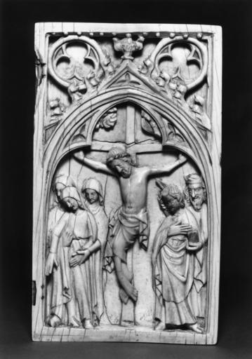 Keywords: French - Diptych Leaf with the Crucifixion - Walters 71277.jpg This large and coarsely carved ivory shows the Crucifixion beneath a single trefoil arch with a crocketed gable and two trefoils above The Three Marys are at the left of the Cross and John and a Hebrew at the right The hinges are missing and a break appears at the upper hinge slot The surface is considerably rubbed; several cracks are visible 3rd quarter 14th century Medieval ivory cm 19 9 11 2 accession number 71 277 31132 Raoul Heilbronner Collection date and mode of acquisition unknown Raoul Heilbronner Sale Paris June 22-23 1921 lot 57 George R Harding London 1921 mode of acquisition unknown Henry Walters city Baltimore Walters Art Museum Henry Walters Acquired by Henry Walters 1921 place of origin France Walters Art Museum license Medieval ivory in the Walters Art Museum Art of France in the Walters Art Museum Media contributed by the Walters Art Museum needs category review |