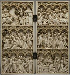 Keywords: French - Diptych with Scenes from the Passion of Christ - Walters 71179 - Open.jpg By the middle of the 14th century the ivory workshops of Paris were creating large-scale diptychs two hinged panels with numerous scenes from the Passion cycle Thirteen are found here reading from top to bottom and left to right Christ's Entry into Jerusalem the Washing of the Feet the Last Supper the Garden of Gethsemane the Arrest of Christ the Hanging of Judas the Flagellation of Christ Christ bearing the Cross to Calvary the Crucifixion the Deposition Entombment Christ appearing to Mary Noli me tangere and Christ's Descent into Limbo Notably Parisian in style are the slender figures with their swayed elegant poses and smooth drapery folds Diptychs were used as aids in prayer by the wealthy owners who commissioned them between 1350 1365 Medieval ivory with traces of paint and gilding cm 25 23 2 1 accession number 71 179 25829 Listed in an inventory dated 1430 of the Treasury of the Cathedral of Vich Catalonia Museum at Vich Spain until 1903 Henry Walters Baltimore date of acquisition unknown by purchase Walters Art Museum Henry Walters Acquired by Henry Walters The International Style The Arts in Europe Around 1400 The Walters Art Gallery Baltimore 1962 Ivory The Sumptuous Art The Walters Art Gallery Baltimore 1983-1984 Images in Ivory Precious Objects of the Gothic Age The Detroit Institute of Arts Detroit; The Walters Art Gallery Baltimore 1997 place of origin Paris France Walters Art Museum license Medieval ivory in the Walters Art Museum Art of France in the Walters Art Museum Media contributed by the Walters Art Museum needs category review |