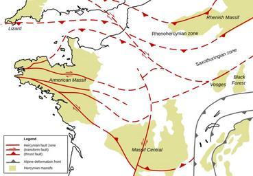 | Keywords: French Hercynian massifs EN.svg Service Géologique National ; 1996 Carte géologique de la France au millionième Éditions BRGM 6<sup>th</sup> ed Paris Debelmas J ; 1974 Géologie de la France 1 vieux massifs et grands bassins sédimentaires Doin éditeurs Paris ISBN 2-7040-0011-5 Martínez-Catalán J R ; 1990 A non-cylindrical model for the northwest Iberian allochthonous terranes and their equivalents in the Hercynian belt of Western Europe Tectonophysics 179 pp 253-272 Matte Ph ; Maluski H ; Rajlich P Franke P ; 1990 Terrane boundaries in the Bohemian Massif Result of large-scale Variscan shearing Tectonophysics 177 pp 151-170 Pharaoh T C ; 1999 Palaeozoic terranes and their lithospheric boundaries within the Trans-European Suture Zone TESZ a review Tectonophysics 314 pp 17-41 own Woudloper 2008-11 Variscan orogeny Geological maps of the Netherlands Geological maps of Belgium Geological maps of France Geological maps of Germany SVG geology Structural geology maps SVG maps in English Geological maps of Switzerland Geological maps of England |