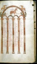 Keywords: French - Leaf from Gospels - Walters W312R - Open Obverse.jpg Frence late Other date century 10 Medieval ink paint parchment cm 31 18 accession number W 3 12R 27575 Abbey Saint-Benoit-sur-Loîre Fleury late 10th century Léon Gruel Paris prior to 1903 mode of acquisition unknown Henry Walters city Baltimore Walters Art Museum Henry Walters Acquired by Henry Walters 1903 place of origin Fleury France Walters Art Museum license 2D Walters MS W3 - Gospels Canon tables Aries astrology |