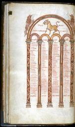 Keywords: French - Leaf from Gospels - Walters W312V - Open Reverse.jpg Frence late Other date century 10 Medieval ink paint parchment cm 31 18 accession number W 3 12V 17605 Abbey Saint-Benoit-sur-Loîre Fleury late 10th century Léon Gruel Paris prior to 1903 mode of acquisition unknown Henry Walters city Baltimore Walters Art Museum Henry Walters Acquired by Henry Walters 1903 place of origin Fleury France Walters Art Museum license 2D Walters MS W3 - Gospels Canon tables Taurus astrology |
