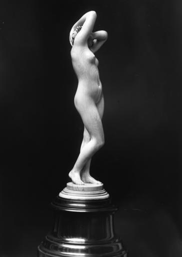 Keywords: French - Phyrne - Walters 71368 - Left Three Quarter.jpg Phyrne stands on an ivory socle mounted on a wooden base Her elaborately braided coiffure is bound with a ribbon and a strand of graduated pearls Turning her head she shields her face with her left forearm Phyrne ambiguously conteracts this gesture of modesty by raising her right arm over her head to display her voluptuous torso to best advantage In the 19th century the famous courtesan was popularized by Jean-Léon Gérôme's masterpiece of 1861 Phyrne before the Tribunal illustrating the titillating moment when the orator Hypereides won his client's acquittal by baring her bosom to the appreciative Athenian judges Having served as the model for Praxiteles and Apelles as well the subject of Phyrne offered artists an occasion for representing an idealized nude Gérôme's figure frequently served as the prototype for representations of Phrne in bronze ivory and silver The anonymous Walters ivory differs from Gèrôme's composition in the position of the figure's arms 2nd half Other date century 19 ivory cm 27 4 accession number 71 368 13264 William T / Henry Walters Collection Baltimore date of acquisition unknown by purchase Walters Art Museum Henry Walters Acquired by William T or Henry Walters The Spectacular Art of Jean-Léon Gérôme Museo Thyssen-Bornemisza Madrid; J Paul Getty Museum Los Angeles; Musee D'Orsay Paris 2010-2011 place of origin France Walters Art Museum license Art of France in the Walters Art Museum Media contributed by the Walters Art Museum needs category review Sculptures in the Walters Art Museum Braids in art |