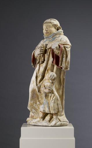 Keywords: French - Saint Cosmas - Walters 27283 - Three Quarter Left.jpg Medieval medicine offered few cures Christians focused their hopes for recovery from illness or accident on their prayers to saints to intercede for them with God Saints Cosmas and Damian Protasius and Gervasius were two pairs of twin brothers who were invoked for their healing of the sick The statues are from the hospital complex at Abbeville built between 1484 and 1492 where they may have stood in niches at the entrance to the church The vigorous modeling and realistic details- as in the variety in their facial expressions- are made more vivid by the use of color and give credibility to the saints' humanity Their size relative to the sick at their feet conveys their superhuman powers while the clerical garments lend them authority The stocky proportions are typical of French sculpture of the late 15th century Saint Cosmas gloves in hand heals a man with a bloated stomach It is likely that he originally held a vessel in his left hand Cosmas and Damian were twin brothers who according to legend practiced as doctors in Cilicia in Asia Minor They are said to have refused all payment in order to convert their patients They were martyred in the 3rd century and are regarded as patrons of doctors and surgeons between 1484 1492 Late Medieval limestone with traces of paint and gilding cm 70 29 22 3 accession number 27 283 10259 From the hospital Hôtel-Dieu Abbeville demolished by 1904 Dikran Kelekian Paris by purchase Henry Walters city Baltimore Walters Art Museum Henry Walters Acquired by Henry Walters 1912 Vive la France French Treasures from the Middle Ages to Monet The Walters Art Gallery Baltimore 1999-2000 place of origin Abbeville France Walters Art Museum license Renaissance sculpture in the Walters Art Museum Art of France in the Walters Art Museum Media contributed by the Walters Art Museum needs category review Vive la France French Treasures from the Middle Ages to Monet |