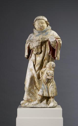 Keywords: French - Saint Cosmas - Walters 27283.jpg Medieval medicine offered few cures Christians focused their hopes for recovery from illness or accident on their prayers to saints to intercede for them with God Saints Cosmas and Damian Protasius and Gervasius were two pairs of twin brothers who were invoked for their healing of the sick The statues are from the hospital complex at Abbeville built between 1484 and 1492 where they may have stood in niches at the entrance to the church The vigorous modeling and realistic details- as in the variety in their facial expressions- are made more vivid by the use of color and give credibility to the saints' humanity Their size relative to the sick at their feet conveys their superhuman powers while the clerical garments lend them authority The stocky proportions are typical of French sculpture of the late 15th century Saint Cosmas gloves in hand heals a man with a bloated stomach It is likely that he originally held a vessel in his left hand Cosmas and Damian were twin brothers who according to legend practiced as doctors in Cilicia in Asia Minor They are said to have refused all payment in order to convert their patients They were martyred in the 3rd century and are regarded as patrons of doctors and surgeons between 1484 1492 Late Medieval limestone paint gilding cm 70 29 22 3 accession number 27 283 10259 From the hospital Hôtel-Dieu Abbeville demolished by 1904 Dikran Kelekian Paris by purchase Henry Walters city Baltimore Walters Art Museum Henry Walters Acquired by Henry Walters 1912 Vive la France French Treasures from the Middle Ages to Monet The Walters Art Gallery Baltimore 1999-2000 place of origin Abbeville France Walters Art Museum license Renaissance sculpture in the Walters Art Museum Art of France in the Walters Art Museum Statues of Saints Cosmas and Damian Media contributed by the Walters Art Museum needs category review Vive la France French Treasures from the Middle Ages to Monet |