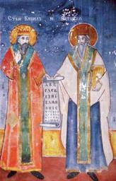Keywords: Freska na Sv. Kiril i Metodij od Sv. Gjorgji Čaniški.jpg mk Чаниште ц ква Св Ѓо ѓи св Ки ил и св етодија севе ен ѕид http //www kalamus com mk/pdf_spisanija/patrimonium_4/24_1 20 20016_4 20Spisanie 202011 20Nikola pdf THE IMAGES OF THE HOLY SLAV TEACHERS ST CYRIL AND ST METHODIUS IN THE FRESCO PAINTING OF THE 19th CENTURY OF PELAGONIJA MARIOVO AND DEMIR HISAR Author 1882 PD-Macedonia Frescos of Saints Cyril and Methodius Frescos in the Republic of Macedonia St George's Church Čanište |