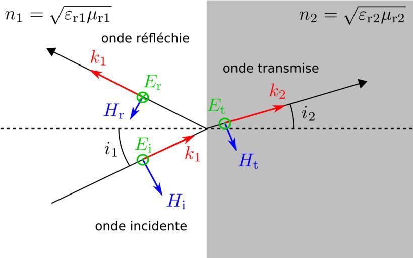 | Keywords: Fresnel-equations-sketch-ET-fr.svg Fresnel equations sketch of incident reflected and transmitted waves for transverse electrical polarisation Are drawn and labelled electric fields E perp to the plane and magnetic fields B in the plane perp to the beam as well as angles with the normal wave numbers vectors along the beams and refracting indices Coefficients de Fresnel schéma des ondes incidente réfléchie et transmise pour la polarisation électrique transverse Sont indiqués les champs électriques E perp au plan et magnétiques B dans le plan perp à la direction de propagation ainsi que les angles d'incidence et de réfraction les nombres d'onde vecteurs le long de la direction de propagation et les indices de réfractions Fresnelsche Formeln Skizze der einfallenden reflektierten und transmittierten Wälen für eine senkrechte Polarisation Wureden gezeichnet die elektrische E and magnetische B Felder Winkel Wälennummer und Brechungsindexe Own Brachycerophilia 2008-06-02 Fresnel equations diagrams Created with Inkscape |