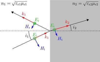 | Keywords: Fresnel-equations-sketch-ET-none.svg Fresnel equations sketch of incident reflected and transmitted waves for transverse magnetical polarisation Are drawn and labelled electric fields E and magnetic fields B as well as angles with the normal wave numbers and refracting indices Coefficients de Fresnel schéma des ondes incidente réfléchie et transmise pour la polarisation magnétique transverse Sont indiqués les champs électriques E et magnétiques B ainsi que les angles d'incidence et de réfraction les nombres d'onde et les indices de réfractions Fresnelsche Formeln Skizze der einfallenden reflektierten und transmittierten Wälen für eine parallele Polarisation Wureden gezeichnet die elektrische E and magnetische B Felder Winkel Wälennummer und Brechungsindexe Editted from Image Fresnel-equations-sketch-ET-fr svg Brachycerophilia User Tttrung 2008-06-02 2008-10-09 Fresnel equations diagrams Created with Inkscape |