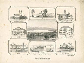 Keywords: Friedrichshafen c1850.jpg Friedrichshafen Sammelbild mit à berblick und Nebenansichten Schloss Friedrichshafen Kloster Hofen Camera obscura Stadtkirche und Rathhaus Gasthof zum deutschen Haus Ruine Montfort Burgruine Argen heute dort Schloss Montfort in Langenargen Bade-Anstalt Hafen Bahnhof ; WLB Stuttgart http //digital wlb-stuttgart de/purl/bsz359023290 ~ 1850 Josef Gerstmeyer PD-old-100 Friedrichshafen in art 1850s lithographs Burg Argen Collections of Württembergische Landesbibliothek |