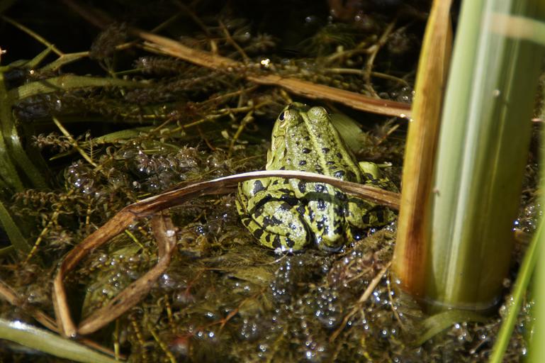 Keywords: frog pond frog amphibian summer fauna pond lake green creature water frog nature animal green frog camouflage hidden hide disguised plant aquatic plants bank near shore reed