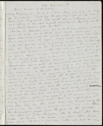 | Keywords: From Anne Warren Weston to Caroline Weston; Monday, February 10, 1845 p1.jpg Page p 1 Call Number Ms A 9 2 v 4 n 28 Format Autograph Letter Extent 4 p 9 5/8 x 7 3/4 in Creator Weston Anne Warren 1812-1890 Date of creation 1845-02-10 inferred Place of creation Boston MA Recipient Weston Caroline 1808-1882; Weston Deborah 1814-1889 BPL department Rare Books Transcription 39 Summer St Dear Caroline Deborah Monday February 10 Lucia I were busy packing the things for Fitchburgh I sent off the package for N B I had letters from Weymouth At night Lucia Emma went with Mary to an Anti Capital Punishment Meeting at the State House Wendell spoke his best Tuesday 11 Wendell came for us at 9 we started with the great black box black trunk hair trunk valise full of book table stuff and one great white wooden box which Lucia would call the coffin I only wished it had screws to it We put our necks in jeopardy on our way to Charleston where the Depot is for the A roads or streets were in such a state that it seemed as tho ™ the carriage must upset but we arrived safely We had Clapp ™s company but luckily for us the weight of it came on Wendell He labored to make himself good with Wendell Defended his conduct on the Rogers case and so forth Dr Farnsworth was in our car part of the time He saw Mrs Child in N Y on his way home from Washington She thought that both herself husband had been abused by the members of the clique in the matter of the Standard I told the Dr that however wrong headed she might be we would give her the credit of not trying to illegible the paper which seemed the fashion now a days At Shirley we took the stage went 9 miles through the severest drifts I was most terribly sick At dark we reached Fitchburgh more dead than alive Mrs Snow a pretty little woman of 25 received us very kindly we went to our room There was a good fire everything very cozy Bro Snow ™s house was turned out of the windows all the elite of Worcester County being met there The Hubbardston people were the first on the ground Also there was James Buffum Mrs Dr Hoyt Miss Riley Cotton Mrs Everett her sister in short their names were legion We had a good tea then all but me went Flickr data on 2011-08-15 Camera Sinar AG Sinarback 54 FW Sinar m Tags dc identifier 08_07_000497 License CC BY 2 0 User Boston Public Library BPL Flickr http //flickr com/photos/24029425 N06/2868685778 From Anne Warren Weston to Caroline Weston; Monday February 10 1845 2008-09-02 16 10 31 creator Anne Warren Weston PD-old-100 User Flickr upload bot/upload 03 00 15 August 2011 UTC Faebot CC BY 2 0 Letter from Anne Warren Weston to Caroline Weston; Monday February 10 1845 Taken with Sinarback 54 |