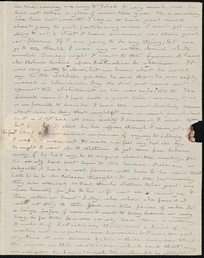| Keywords: From Deborah Weston to Anne Warren Weston; Wednesday, February 1, 1837 p3.jpg Page p 3 Call Number Ms A 9 2 v 9 n 12 Format Autograph Letter Signed Extent 4 p 10 x 7 7/8 in Creator Weston Deborah 1814-1889 Date of creation 1837-02-01 Place of creation New Bedford MA Recipient Weston Anne Warren 1812-1890 Place of receipt Boston MA BPL department Rare Books Transcription lecture Sunday evening liked it very much said he had not taken a glass of wine this year He is something like Ben but smarter I begin to have great doubts about going to such parties any more I don ™t get anything to eat that I have discovered was their greatest pleasure If I am going to do anything let me go to the theatre I wore my or rather Maria ™s white muslin Tuesday night I went to the Lyceum heard Mr Holmes ™ lecture upon Radicalism ultraism It was very witty clever but you know what he would say On the abolition question he said that he was safely moored in Colonization Bay He did not come out against the abolitionists as he was expected to The Liberator came I had such a good time reading it as is impossible to describe I had the most shocking dream about dear Mr May that night I was as much overwhelmed by it as if it had all been reality I dreamed I went to his funeral stood by his coffin though I never got sight of his face I have a most distinct impression of crying sobbing that I was worn out It made me feel very sad all day Tonight I went up to Nathans ™ to get some free labour candy if he had any to enquire about the meeting for the society here sent him Old Andrew Robeson as delegates I had a real powwow with him him he said that both he Mr Robeson thought it was the best meeting they ever attended Mr Bent thinks Nathan takes great airs upon himself for he his wife went in a carriage I then called at Aunt Sally ™s who when she found I would not stay to tea gave me two pieces of cake a large paper of raisins nuts to bring home in my bag As for the female society here there is nothing to make it of Last Saturday there was a kind of a meeting not a regular one however I was too sick to go There it was decided by two or three members that the clause in the constitution which said that anyone can join by paying 50 cents c should be altered Flickr data on 2011-08-03 Camera Sinar AG Sinarback 54 FW Sinar m Tags dc identifier 08_07_000029 License CC BY 2 0 User Boston Public Library BPL Flickr http //flickr com/photos/24029425 N06/2652311469 From Deborah Weston to Anne Warren Weston; Wednesday February 1 1837 2008-07-08 15 40 06 Weston Deborah 1814-1889 PD-old-100 User Flickr upload bot/upload 08 09 3 August 2011 UTC Fæ CC BY 2 0 Deborah Weston anti-slavery letters Photos uploaded from Flickr by Fæ using a script Taken with Sinarback 54 |