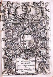 Keywords: Frontispicio de los Anales de la Corona y Reino de Aragón de Uztarroz.jpg es Frontispicio de los Anales de la Corona y Reino de Aragón de Juan Francisco Andrés de Uztarroz En el centro el Escudo de Aragón rodeado en su corona exterior por de arriba a abajo y de izquierda a derecha por los de Cataluña Valencia Nápoles Neopatria Mallorca Sicilia Jerusalén y Cerdeña; y en la Corona interior por los emblemas de desde arriba en el centro y en sentido contrario a las agujas del reloj Zaragoza Huesca Jaca Barbastro Daroca Borja Alcañiz Teruel Calatayud Albarracín y Tarazona http //www derechoaragones es/es/catalogo_imagenes/grupo cmd posicion 189 path 1269 forma presentacion pagina config_zoom S Juan de Renedo grabado herederos de Pedro Lanaja editor Juan Francisco Andrés de Uztarroz texto 1663 Escudo de Cataluña 1663 jpg PD-old-100 Coats of arms of the crown of Aragon Frontispieces from Spain Historical images of Aragon Coats of arms of Aragon Coats of arms of the Kingdom of Aragon 1663 Literature of Spain Spain in the 1660s |