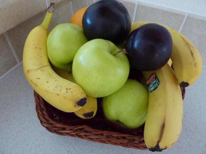 Keywords: fruit basket apples bananas apple food yellow green bunch banana fruits healthy health snack purple plum plums eat edible eating kitchen