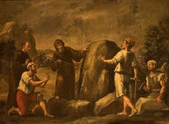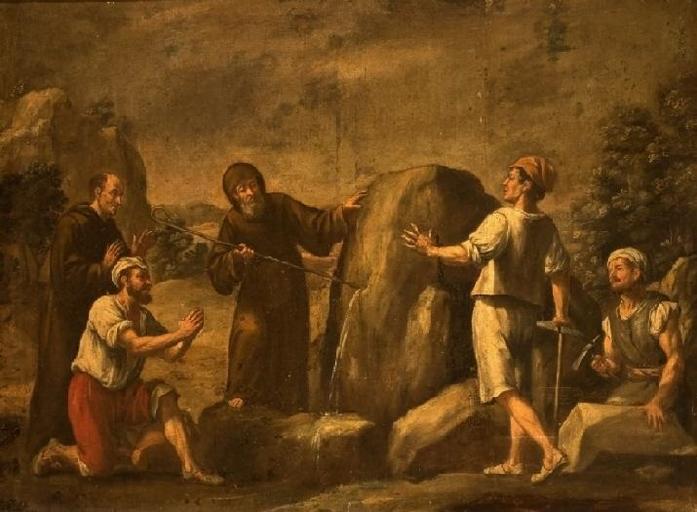 Keywords: Fuente milagrosa en el convento de Paula (Museo de Bellas Artes de Sevilla).JPG En esta obra es representado el milagro que según la tradición realizó San Francisco de Paula durante la construcción del convento de la ciudad italiana de Paula ya que cuadno los obreros se mostraron contrariados por la imposibilidad de beber agua en las cercanías del lugar San Francisco de Paula «punzó» con su báculo una piedra que se hallaba al pie de un monte e inmediatamente brotó una fuente de agua circa 1700 1710 oil canvas Size cm 109 85 Institution Museo de Bellas Artes Seville http //ceres mcu es/pages/Main object history Esta obra procede del desaparecido convento de San Francisco de Paula de Sevilla España que fue desamortizado y demolido en el siglo XIX exhibition history credit line accession number CE0932P http //ceres mcu es/pages/Main PD-old-100 Paintings of Saint Francis of Paola in Spain Paintings by Lucas Valdés in the Fine Arts Museum of Seville 18th-century paintings in the Fine Arts Museum of Seville