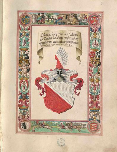 | Keywords: Fugger Ehrenbuch 091.jpg Geheimes Ehrenbuch der Fugger hergestellt in der Werkstatt Jörg Breu d J 1545 “1549<br /> Seite mit ornamental und figürlich illustriertem Rahmen sowie dem Wappen der Sidonia Wazler von Colaus http //daten digitale-sammlungen de/~db/0004/bsb00042105/images/ 1545 “1549 workshop PD-old-100 Geheimes Ehrenbuch der Fugger Frames in Geheimes Ehrenbuch der Fugger Coats of arms in Geheimes Ehrenbuch der Fugger Coats of arms of Colaus family Colaus Coats of arms of Harrach family Coats of arms of Kirchberg family Coats of arms of Fugger von der Lilie family |