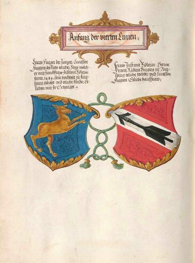 | Keywords: Fugger Ehrenbuch 348.jpg  Geheimes Ehrenbuch der Fugger hergestellt in der Werkstatt Jörg Breu d J 1545 “1549<br /> Seite 348 Stammreihen der Fugger vom Reh Wappen Lucas Fugger vom Reh d J Justina Ridlerin Ridler Hinweis Eine Seitenzahl 349 gibt es in der handschriftlichen Paginierung der Handschrift nicht Die nächste Seite ist mit 350 bezeichnet http //daten digitale-sammlungen de/~db/0004/bsb00042105/images/ 1545 “1549 workshop PD-old-100 Geheimes Ehrenbuch der Fugger Coats of arms in Geheimes Ehrenbuch der Fugger Coats of arms of Fugger vom Reh family Coats of arms of families of Germany - R Ridler Arrows in heraldry |
