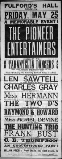 Keywords: poster blackandwhite monochrome text black and white Arrangement of text. "The Pioneer Entertainers" is white on a black panel. Quantity: 1 b&w art print(s). Physical Description: Woodblock, black on white paper, 1005 x 383 mm. Evening Post (Wellington, N.Z.). Fulford's Hall, Brooklyn :Friday, May 25 [1906]; A memorable event, The Pioneer Entertainers, headed by the 8 Tarantella Dancers ... and introducing ... Len Sawtell ... Charles Gray ... Miss Hermann ... The Two D's ... Raymond & Howard ... Miss Muriel Devine ... The Hunting Trio ... Frank Bust ... C. E. Thompson. Printed at the Evening Post Theatrical and General Show Printing Works, Willis Street, Wellington - 14462.. Ref: Eph-E-VARIETY-1906-01. Alexander Turnbull Library, Wellington, New Zealand. natlib.govt.nz/records/22760020 Arrangement of text. "The Pioneer Entertainers" is white on a black panel. Quantity: 1 b&w art print(s). Physical Description: Woodblock, black on white paper, 1005 x 383 mm. Evening Post (Wellington, N.Z.). Fulford's Hall, Brooklyn :Friday, May 25 [1906]; A memorable event, The Pioneer Entertainers, headed by the 8 Tarantella Dancers ... and introducing ... Len Sawtell ... Charles Gray ... Miss Hermann ... The Two D's ... Raymond & Howard ... Miss Muriel Devine ... The Hunting Trio ... Frank Bust ... C. E. Thompson. Printed at the Evening Post Theatrical and General Show Printing Works, Willis Street, Wellington - 14462.. Ref: Eph-E-VARIETY-1906-01. Alexander Turnbull Library, Wellington, New Zealand. natlib.govt.nz/records/22760020 |