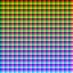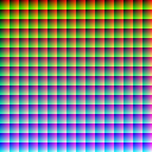 | Keywords: Full 24bit RGB palette.png This image displays all of the 16 777 216 2<sup>24</sup> possible colors in the 24-bit RGB cube palette as seen from progressive slices through the blue axis of the RGB color cube In each slice the red color is in the horizontal X axis and the green color is in the Y axis The blue color would be in the Z axis perpendicular to the screen The top-left pixel is black while in the opposite corner we have the white color The image was rendered using PHP and GD 2006-10-01 own assumed LucasVB Color palettes |