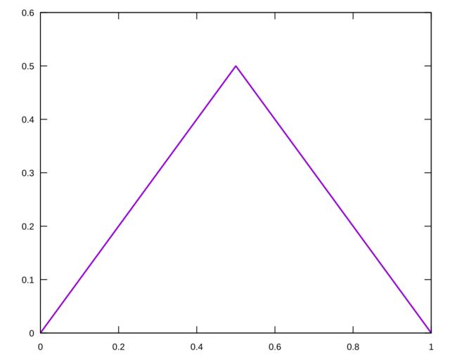 | Keywords: Function x for x smaller 0.5 and 1-x for x bigger 0.5.svg en The function <math>f 0 1\to\R \begin cases x x \le \frac 12 \\ 1-x x > \frac 12\end cases </math> 2016-08-31 own Stephan Kulla other versions Created with Gnuplot set terminal svg set output Function x for x smaller 0 5 and 1-x for x bigger 0 5 svg set samples 1000 set xrange 0 1 set yrange 0 0 6 plot x < 0 5 x 1-x notitle lw 2 cc-zero Function plots Continuity functions Piecewise linear functions | ||||