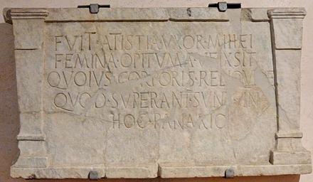 | Keywords: Funeral stele Atistia Terme.jpg Funeral stele of Atistia Latin inscription Fuit Atistia uxor mihei/ femina opituma ueixsit/ quoius corporis reliquiæ/ quod sic superant sunt in/ hoc panario Atistia was my wife She lived as an excellent woman whose surviving remains are in this bread basket Found at the Porta Maggiore 1838 es Placa funeraria romana encontrad cerca de Porta Maggiore en Roma en 1838 correspondiente con CIL VI 1958b CIL I 1206 p 970 AE 1993 109 AE 2004 123 Fuit Atistia uxor mihei/ femina opituma veixsit/ quoius corporis reliquiae/ quod sic superant sunt in/ hoc panario Stèle funéraire Inscription latine « Fuit Atistia uxor mihei / femina opituma ueixsit / quoius corporis reliquiæ / quod superant sunt in / hoc panario » « Atistia était ma femme Elle a vécu la vie d'une excellente femme ce qui reste de son corps se trouve dans ce panier à pain » H 72 cm 28 ¼ in W 110 cm 43 ¼ in Museum Terme di Diocleziano Corpus inscriptionum latinarum 1 2 1206 object history credit line accession number Jastrow 2006 other versions Ancient Roman funerary steles in Rome Latin inscriptions in Rome Museo delle Terme Ancient Roman inscriptions in Rome Terme Ancient Roman gravestones in Rome Terme Ancient Roman inscriptions in the Museo delle Terme di Diocleziano Tomb of Eurysaces Rome 1838 Ancient Roman women Atistia CIL I² 001016 CIL VI 001958b AE 1993 0109 AE 2004 0123 |