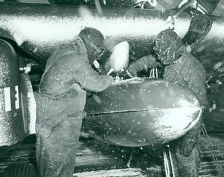 | Keywords: blackandwhite monochrome black and white 80-G-422341.  USS Philippine Sea (CV-47).  Crewmen Gerald F. Quay (AMM3c) and Warren E. McKee (PH2c) check braces on a napalm tank, during a snowstorm off North Korea, 17 November 1950. The weapon is mounted on the port wing of a Douglas AD "Skyraider" parked on the carrier's flight deck. Official U.S. Navy Photograph, now in the collections of the National Archives. 80-G-422341.  USS Philippine Sea (CV-47).  Crewmen Gerald F. Quay (AMM3c) and Warren E. McKee (PH2c) check braces on a napalm tank, during a snowstorm off North Korea, 17 November 1950. The weapon is mounted on the port wing of a Douglas AD "Skyraider" parked on the carrier's flight deck. Official U.S. Navy Photograph, now in the collections of the National Archives. |