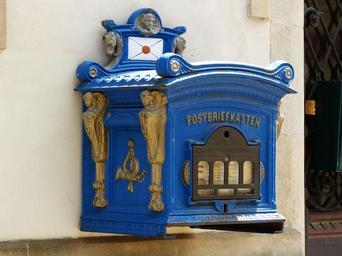 Keywords: güstrow mecklenburg mecklenburg western pomerania post mailbox post horn letter boxes blue send historically