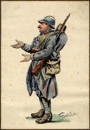 Keywords: university of victoria universityofvictoria uvic great britain. army. royal regiment of artillery greatbritainarmyroyalregimentofartillery caricatures and cartoons--20th century caricaturesandcartoons20thcentury notebooks war artists warartists world war, 1914-1918--pictorial works worldwar19141918pictorialworks world war, 1914-1918--caricatures and cartoons worldwar19141918caricaturesandcartoons people outdoor photo border Item is one of 123 pen-and-ink drawings and watercolours from two volumes titled: "Sketches of the War: France/Belgium". The sketches vary from satirical cartoons to more detailed and naturalistic renditions. They are often accompanied by an ironic title and are often signed with the artist's initials, "J.M." The artist's satirical targets include the officers and high command of both combatant sides; the disjuncture between reported and actual events, and the death of civilians as a fact of modern warfare. Item is one of 123 pen-and-ink drawings and watercolours from two volumes titled: "Sketches of the War: France/Belgium". The sketches vary from satirical cartoons to more detailed and naturalistic renditions. They are often accompanied by an ironic title and are often signed with the artist's initials, "J.M." The artist's satirical targets include the officers and high command of both combatant sides; the disjuncture between reported and actual events, and the death of civilians as a fact of modern warfare.
