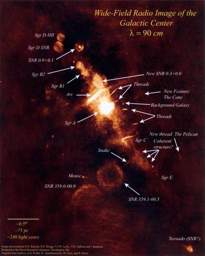 Keywords: Galactic Center Radio Image.jpg en At approximately 2 degrees on a side the full moon is about 1/2 degree across or about 1000 light years at the distance of the center of the Milky Way the image is shown in false color with brightness indicating areas of intense radio emission and surrounding dark areas indicating less intense radio emission Dark lines near the center of the image are artifacts of the image processing The concentration of radio sources along a diagonal line through the image reveals the disk-like shape of the Milky Way viewed edge-on 2012-09-05 11 46 50 http //www nrl navy mil/media/news-releases/1998/wide-field-radio-imaging-of-the-galactic-center N E Kassim D S Briggs T J W Lazio T N LaRosa J Imamura NRL/RSD PD-USGov Galactic Center Astronomical objects Radio astronomy |