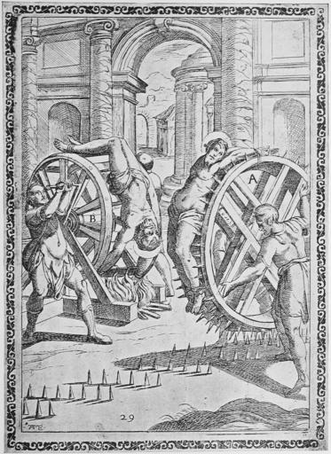 Keywords: Gallonio Tortures 1591 p08.jpg Woodcut by Tempesta showing a torture/execution scene of martyrs from Gallonio's Tortures and Torments of the Christian Martyrs «Trattato degli instrumenti di martiro e delle varie maniere di martoriare usate da' gentili contro christiani descritti et intagliate in rame; opera di Antonio Gallonio» first publication Rome 1591 / scans from a 1904 reprint woodcut by Antonio Tempesta Reproduction of a painting that is in the public domain because of its age PD-old-100 Trattato degli instrumenti di martiro Breaking wheels |