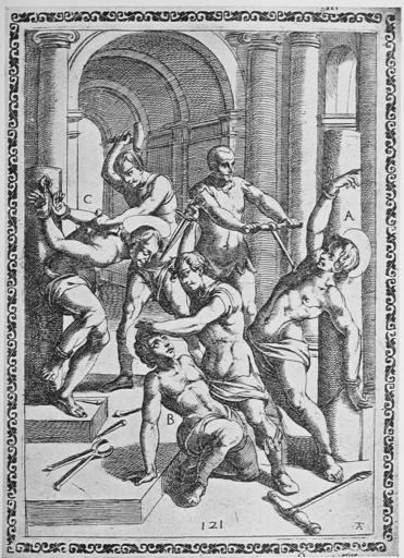 | Keywords: Gallonio Tortures 1591 p31.jpg  Woodcut by Tempesta showing a torture/execution scene of martyrs from Gallonio's Tortures and Torments of the Christian Martyrs «Trattato degli instrumenti di martiro e delle varie maniere di martoriare usate da' gentili contro christiani descritti et intagliate in rame; opera di Antonio Gallonio» first publication Rome 1591 / scans from a 1904 reprint woodcut by Antonio Tempesta Reproduction of a painting that is in the public domain because of its age PD-old-100 Trattato degli instrumenti di martiro |