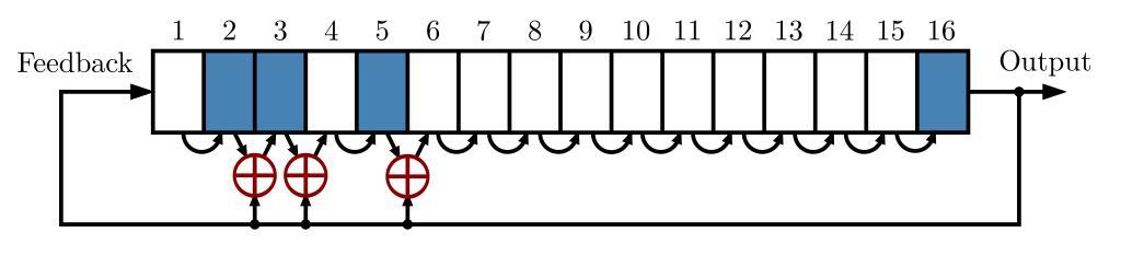 | Keywords: Galois LFSR.svg A Galois-configuration Linear Feedback Shift Register LFSR The taps are 16 5 3 2 0 The chacteristic polynomial is therefore <math>x 16 + x 5 + x 3 + x 2 + 1\ </math> This generates the same sequence as this Fibonnacci-configuration LFSR taps 16 14 13 11 0 self-made Inkscape 01/10/2007 Inductiveload Cryptography diagrams |