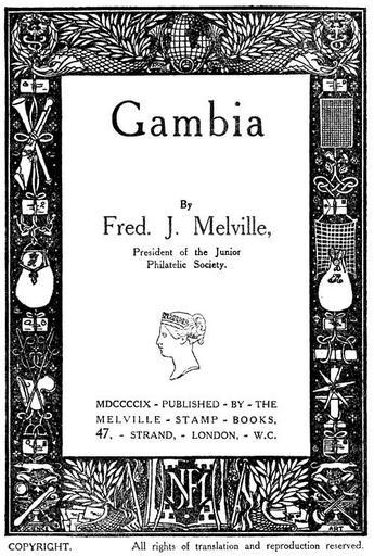 | Keywords: Gambia title page Fred Melville.jpg en Title page from book published in 1909 Author died 1940 http //www templarphilatelics co uk/index php cat Free_Philatelic_eBooks Melville Stamp Books 1909 PD-old Philatelic literature Post of Gambia Fred Melville |