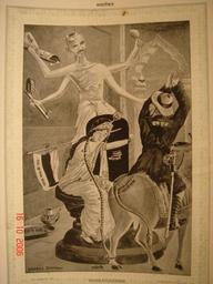 Keywords: Gandhi as Shiva, saving his devotee, Bharat, from a British-looking "Yam Raj.jpg en Gandhi as Shiva saving his devotee Bharat from a British-looking Yam Raj the Vedic god of death bazaar art 1930's Source ebay Oct 2006 1930's http //www columbia edu/itc/mealac/pritchett/00routesdata/1900_1999/gandhi/gandhigods/gandhigods html bazaar art PD-Art Uploaded with UploadWizard Caricatures of Mohandas K Gandhi |