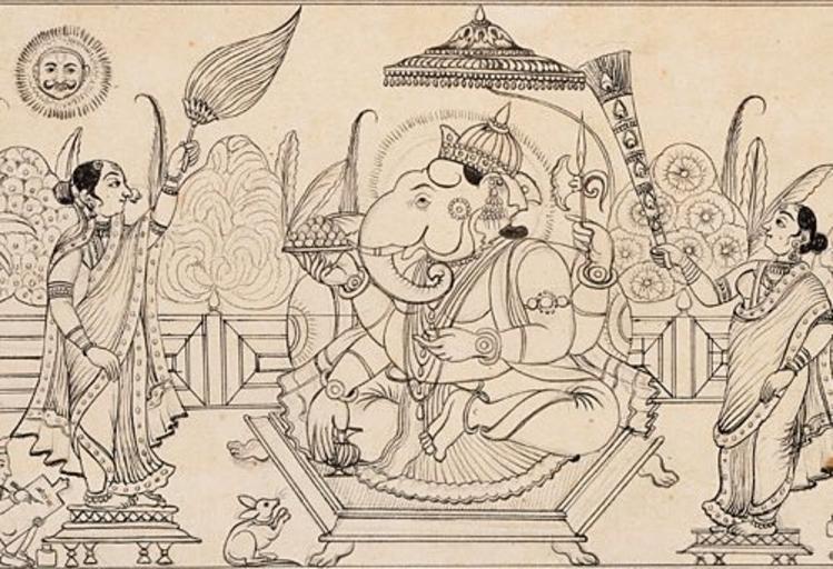Keywords: Ganesha ink.jpg Ink drawing of Ganesha under an umbrella with his two wives who are fanning him His rat is in the foreground to the left The sun with a face shines upon the scene Various trees in the background Ganesja under ein parasoll med dei to konene sine som vifter han Sol med fjes i himmelen rotta han rir på i forgrunnen tre i bakgrunnen India Karnataka Mysore Bhagavata Purana Ancient Stories of the Lord Manuscript Museum Number M 91 349 4 LACMA http //www mythfolklore net/india/galleries/2/ganesha_ink htm early 19th century author PD-art Paintings of Ganesha Ink drawings 19th-century drawings Drawings of people of India Bhagavata Purana Paintings from Karnataka Polygamy Drawings from India in the Los Angeles County Museum of Art Mysore in the 1800s Chamara Rats in art 1800s paintings from India Manuscripts from India in the Los Angeles County Museum of Art |