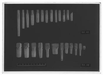 Keywords: Gängtappar, 13 stycken - Livrustkammaren - 78063-negative.tif Ur Johan Rings bössmakarverkstad 13 stycken gängtappar av stål i olika storlekar alla med fyrsidigt huvud som övergår i en gängad cylinder med fyra längsgående skåror Allt förvaras i en brun pappask med etikett som vittnar om tidigare innehåll av fotografiska glasplåtar original caption ca 1900 size mm 7 minsta size mm 11 största g 255 m ask LRK Johan Ring bössmed place of origin original filename LN_B07309_B10189 54315 inventory number LRK 18366 78063 CC0 Gängtappar 13 stycken - Livrustkammaren - 78063 tif |