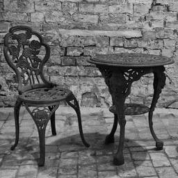 Keywords: garden chair garden table old cast iron pans ornaments roses antique rusty historically